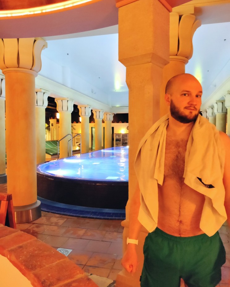Ostaessamme lippuja kylpylään, jäin hieman kaipailemaan asiakaspalvelusta tietoja siitä miten kylpylässä toimitaan. Olisi esimerkiksi ollut ihan mukava tietää, mistä itse kylpylään mennään. En ollut ainoa, joka oli hukassa naisten pukuhuoneessa, kun ei löytänyt aikuisten puolen ovea eikä kylttejä mistään. Villekin eksyi miesten puolelta vesipuistoon ja tuli sitä kautta, eikä löydetty toisiamme ekaan varttiin. 😂 En tykkää saunoa piilarit silmissä, kun ne kuivuvat, niin on vielä erityisen haastavaa löytää toista hämyisessä kylpylässä puolisokeana.
