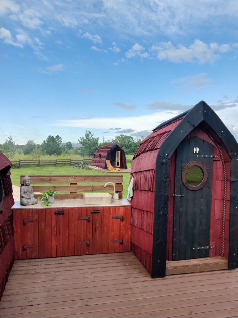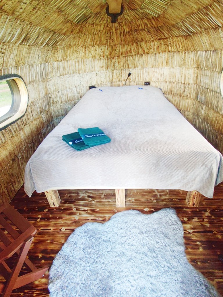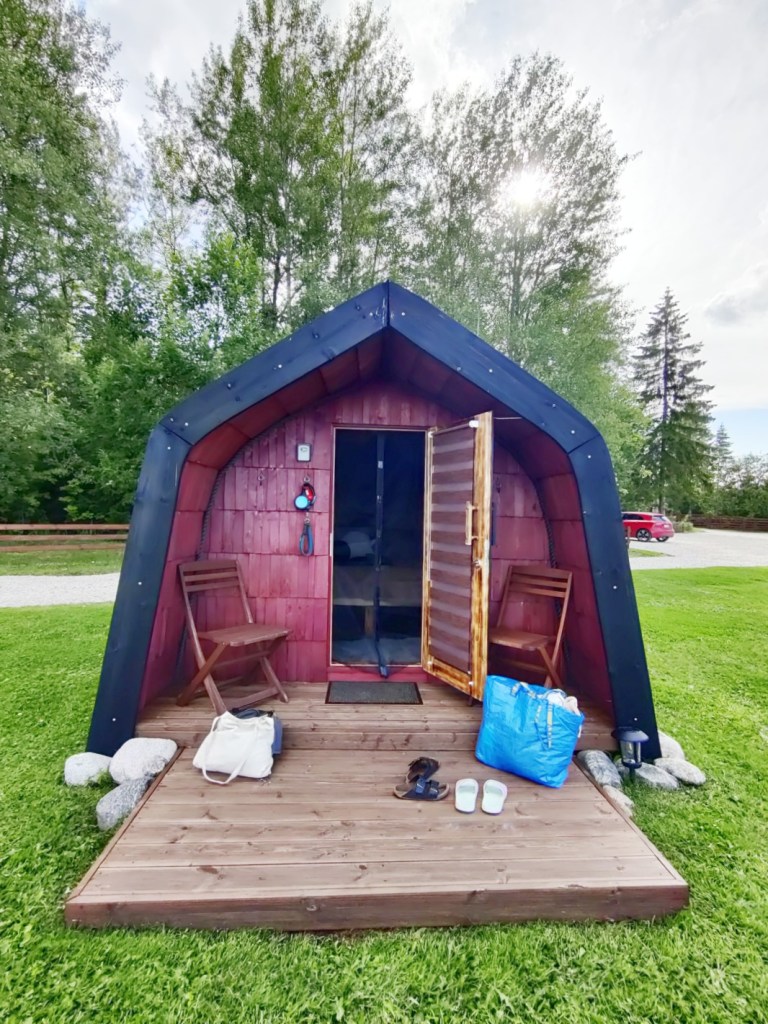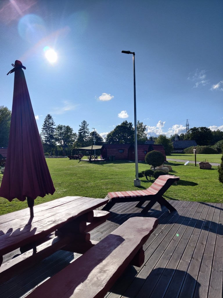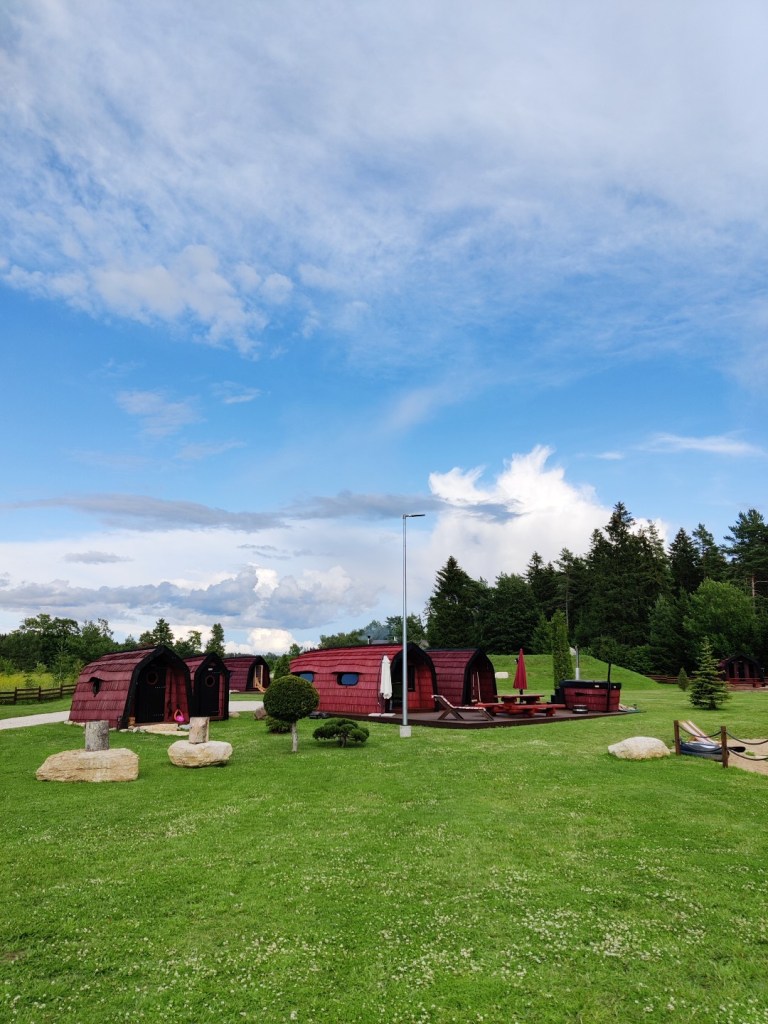 Kylä koostui söpöistä pikkuruisista majoista, joita oli ripoteltu pitkin isoa nurmikkoaluetta. Varattavien nukkumamajojen lisäksi alueelta löytyy keittiö ja ruokailutila, suihkumaja ja vessamaja sekä ihana saunakompleksi. Pihalla on myös pieni lampi, jossa uida, mutta sen vesi oli todella matalalla ja pohja todella mutainen, niin kävimme täällä pulahtamassa vain kerran. Sauna oli todella miellyttävä kokemus ja siellä sai ihanat pehmeät löylyt. Uimisen lisäksi pihalla pystyi viilentymään ulkosuihkussa.