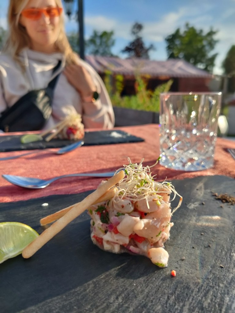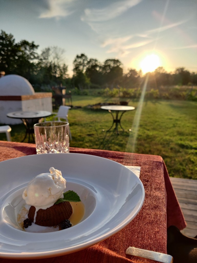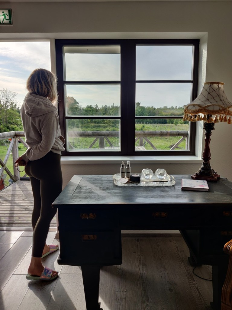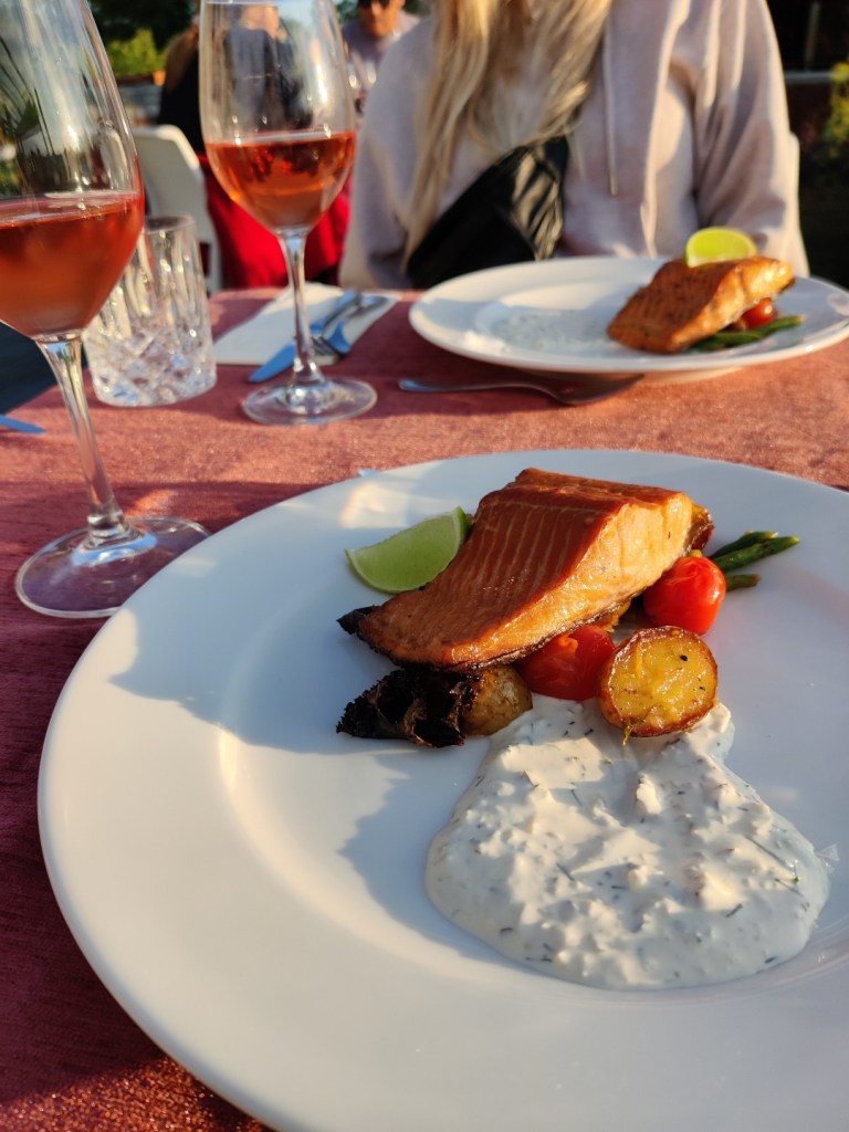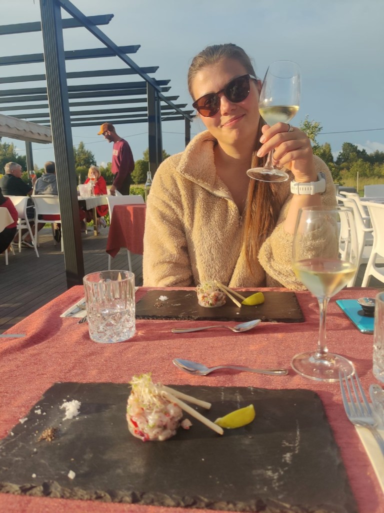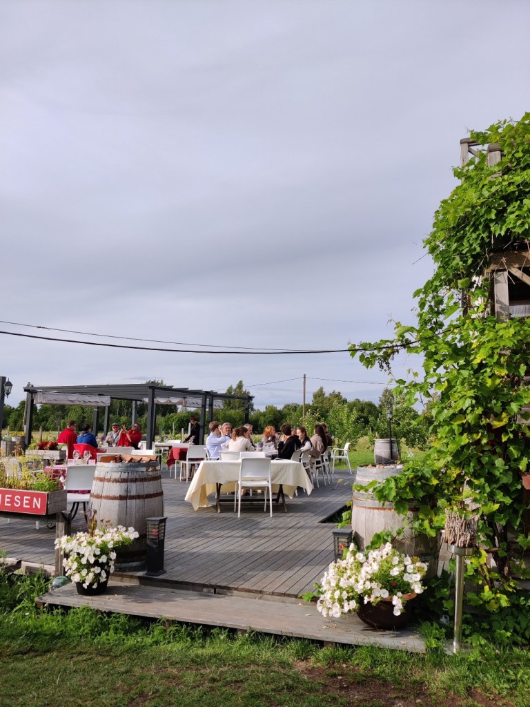 Muhu Veinitalun upea ulkoilmaravintola tarjoili meille erittäin herkullisen kolmen ruokalajin illallisen auringon laskiessa hiljalleen mailleen. Ruokalajien kylkeen oli tietenkin paritettu oman talon viinit. Raparperi jälkiruokaviini oli niin maittava, että ostettiin sitä molemmat myös pullot kotiin viemisiksi. Tätä kyseistä viiniä löytyy myös yhdestä Viron Michelin-ravintoloista. Viinitilan viljelijä ja isäntä oli suomalaislähtöinen mies, joka kertoili meille illan aikana paljon viineistä ja tilan historiasta. Hän tietenkin rakastui Möhköön ❤