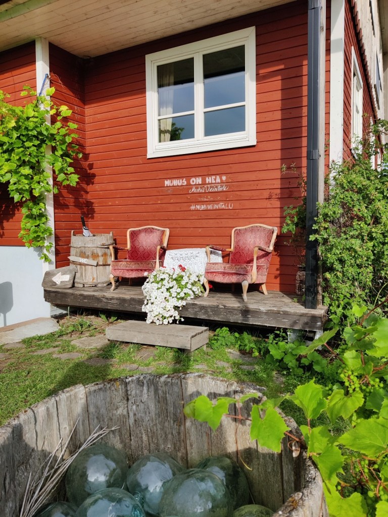 Viron ensimmäiseksi viinimatkailutilaksi itseään tituleeraava Muhu Veinitalu on todella sympaattinen maatilamatkailukohde, jonka yhteydessä toimii viinitilan lisäksi ravintola. Huoneet sijaitsevat kaikki vanhassa päärakennuksessa, ravintolan keittiö ulkosalla viiniköynnösten keskellä ja lisäksi alueelta löytyy erillinen saunarakennus. Tiesin välittömästi omistavien olevan hienoja ihmisiä, kun pihalle käyskenteli bull-rotuinen koira. Tämä vanha narttukoira ei toki Möhköstä välittänyt, mutta se annettakoon hänelle anteeksi.