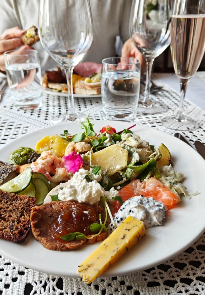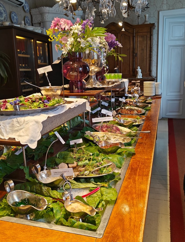 Erikoisempia ruokia ja ehdottomia lemppareitani ovat muun muassa Tertin kesäkurpitsafalafelit, tryffeliaioli, vegaaninen salami, kukkakaaliceviche ja herukanlehti-graavilohi. Aivan varmasti jokaiselle jotakin ja vielä enemmän. Juomana meillä on kartanon alkoholitonta ruusukuohua.