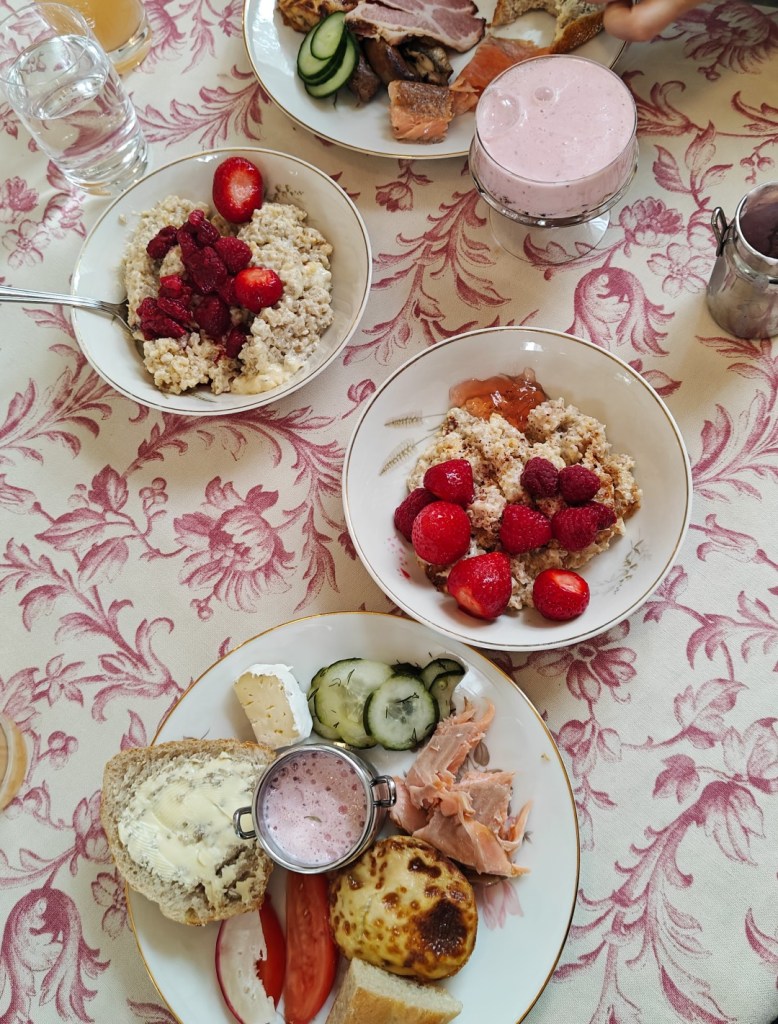 Odotukset ovat aamiaisen suhteen korkealla eilisen makuelämyksen jäljiltä emmekä todellakaan joudu pettymään. Samanlaista runsauden ilotulitusta ei aamiainen pidä sisällään, mutta täydellisen määrän huolella valittuja, käsittämättömän herkullisia ruokia: itse tehdyt leivät, smoothie, mielettömät kananmunat ja eiliseltä tutut mummonkurkut.