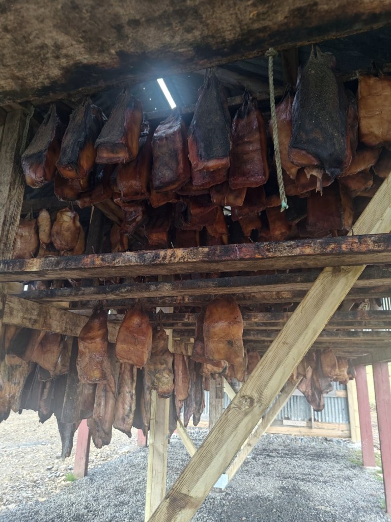 Vierailumme alkuun kuului mielenkiintoinen opastus ja tarina perheyrityksen hain lihan valmistuksesta. Hain lihassa käytetään Pohjois-Atlantin jäähaita (holkeri), joka on yksi maailman vanhimmiksi eläviä eläimiä (jopa 400 vuotta) ja elää usein sokeana merien syvyyksissä. Oli huojentavaa kuulla, että haita ei enää metsästetä. Mutta ei sekään toki niin kivalta tunnu, että tänne päätyvät hait ovat joka tapauksessa kalastuksen sivusaalista.